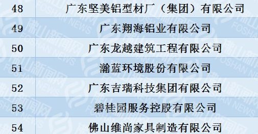 12月17日,佛山市企业联合会、佛山市企业家协会首次发布佛山企业100强榜单。该榜单以2018年企业营业收入为基本标准,综合考虑企业经营指标而得出。榜单的上榜门槛是27亿元,百强企业总营收达到13463.6亿元。 MK平台铝业位居49名。 原文来源 搜狐新闻