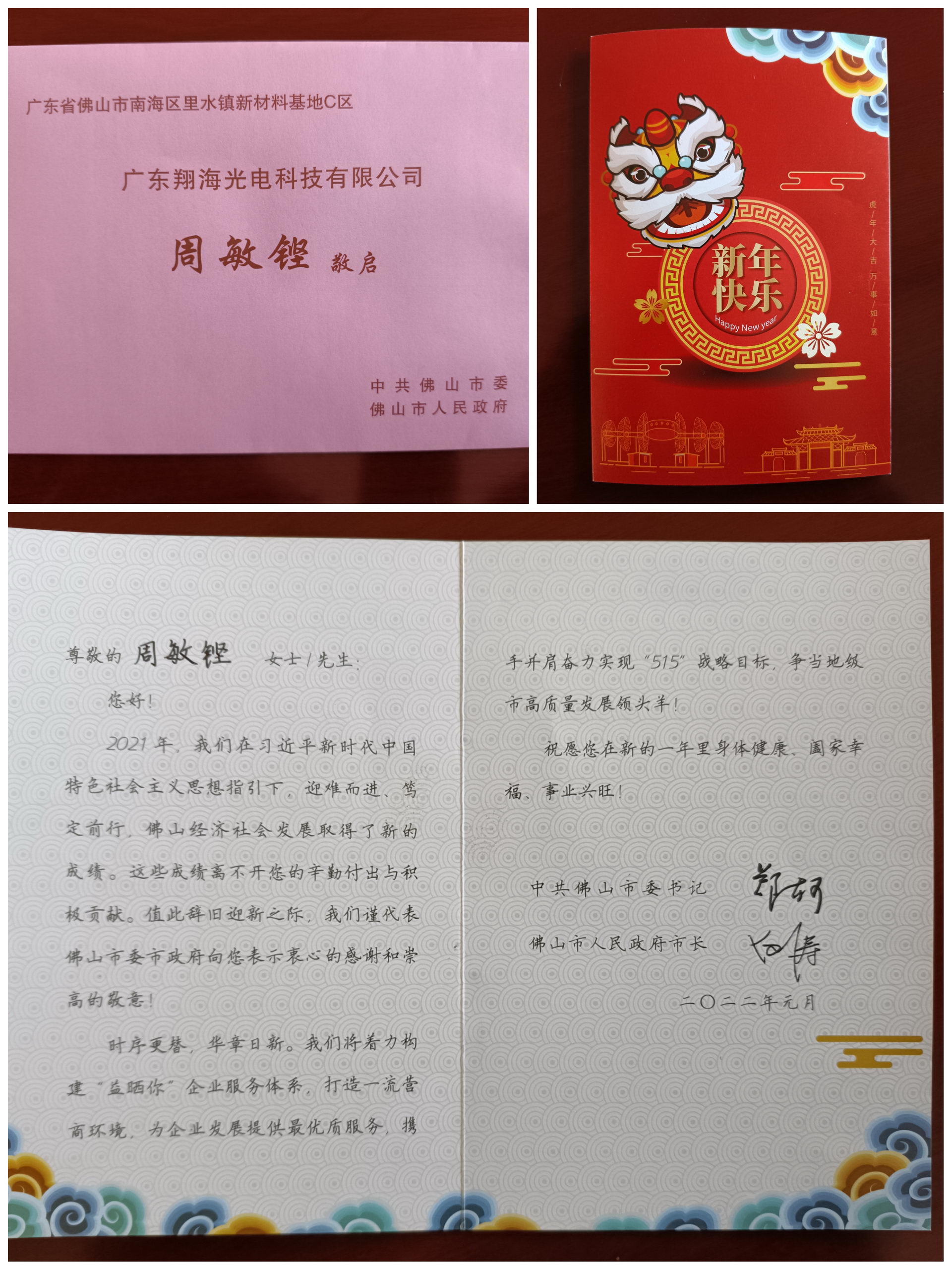 值此辞旧迎新之际,广东MK平台MK网页版有限公司收到了来自佛山市委、市政府的新年贺卡,深切感受到了党和政府对企业的关心与祝福,倍感温暖、备受鼓舞。
