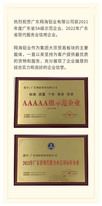 喜报 | MK平台铝业获评广东省5A级示范企业、现代服务业信用标杆企业